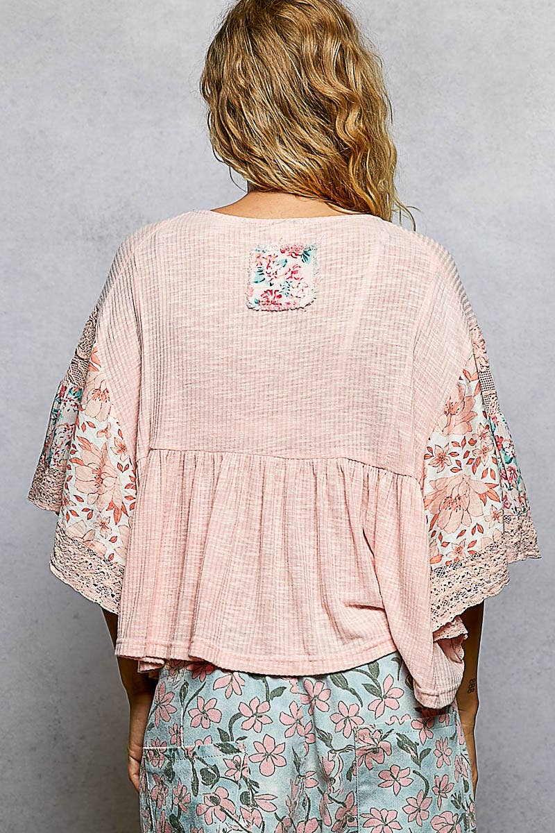 Rib Floral Pattern Round Neck Short Sleeve Top